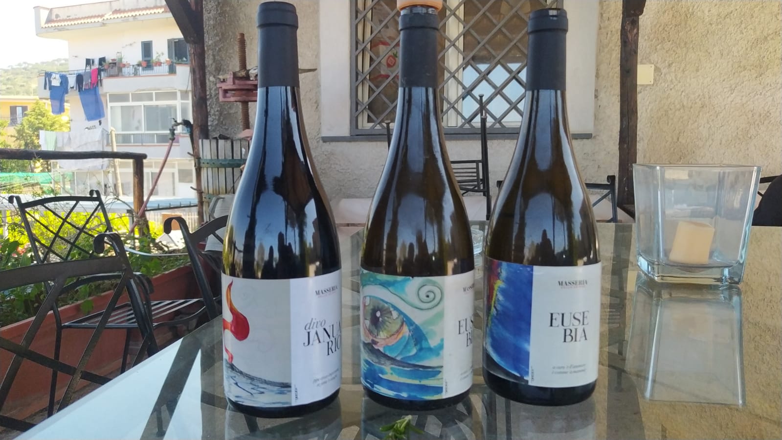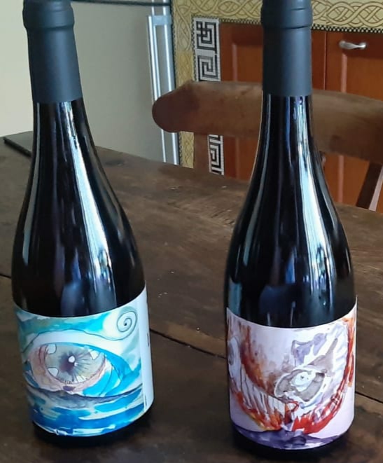 Dall’ incontro con Francesco Andoli attuale titolare del Risto bottega Januarius sito in via Duomo a Napoli, ho avuto il piacere di collaborare ad un progetto grafico per delle etichette di due vini molto importanti della zona Vesuviana presso la “Masseria dello Sbirro” ad Ercolano di Carlo Cozzolino e Cristina Leardi presidentessa Nazionale Consorzio pomodori del piennolo e friariello Vesuviano. Dopo l’incontro con gli imprenditori succitati tramite Francesco Andoli giornalista gastronomico e operatore nel campo degli eventi culturali Napoletani, è partito il progetto grafico per le etichette delle bottiglie del Lacrima Christi bianco e rosso “Divo Januarius” ed ‘Eusebia“. La progettazione grafica è stata affidata a me come Artista grazie all’ accorta selezione di Francesco Andoli il signor Carlo Cozzolino e la presidentessa Cristina Leardi che hanno ritenuto opportuno mi occupassi dei disegni delle etichette che avrebbero poi pubblicizzato i vini pregiati. I risultati non si sono fatti assolutamente attendere sia per la mole di vendita delle bottiglie di vino sia per la sostanziosa attrazione che le etichette hanno avuto sul pubblico acquirente delle stesse bottiglie. Si sono fatto avanti anche rappresentanti Nazionali Francesi della nota casa Antinori per l’acquisto di queste ” bottiglie di Arte” che hanno avuto un supporto coloristico con queste grafiche esplosive laviche e piroclastiche