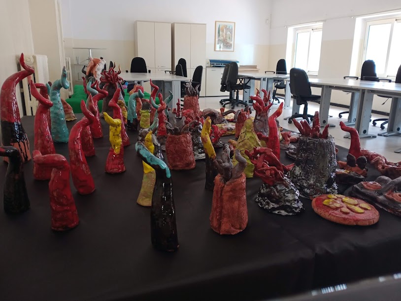 Grazie alla dottoressa Fiorella Esposito e la sua collaboratrice Carmela Romano, ho avuto il piacere di seguire Corsi di Ceramica e Pittura in un Campo Estivo al Quarto Circolo Didattico Nosengo del mio Paese di origine, Arzano (NAPOLI). Sono passato dai banchi alla “cattedra” grazie a questo assist e meravigliosa opportunità offertami dal comparto scolastico dello stesso istituto. Il progetto richiedeva l’esecuzione di un murales, eseguito dai bambini sotto la mia direzione, la raffigurazione di tutto ciò che concerne il periodo pandemico, con tanto di illustrazioni grafiche.